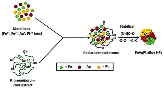 Figure 9. Schematic depiction of the role of P. grandiflorum in the Fe-Ag-Pt alloy NP formation. Reproduced from [27], with permission from Elsevier, 2017.