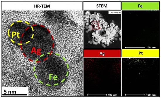Figure 10. HRTEM images and HAADF-STEM images of Fe-Ag-Pt NPs and the elemental mapping of Pt, Fe, and Ag NPs. Reproduced from [27], with permission from Elsevier, 2017.