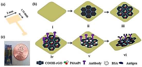 Figure 11. Schematic illustrations of the (a) sensing platform, (b) preparation sequence of trimetallic PdAuPt/COOH-rGO immuno-sensor for the CEA/PSA detection; photomicrograph of the (c) advanced immunosensors. Reproduced from [119], with permission from Elsevier, 2018.