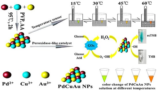 Figure 12. Pd-Cu-Au trimetallic NPs synthesized to be applied as temperature sensors and for colorimetric H2O2 detection as well as glucose with enzyme mimic. Reused from [122]. An Open Access Article, (CC BY 4.0).