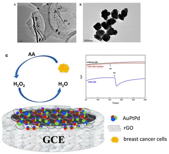 Figure 14. (A,B) TEM images of varying magnifications of AuPtPd/rGO. (C) AuPtPd/rGO-modified GCE employed for identifying H2O2 released from cells. Reproduced from [39], with permission from Elsevier, 2018.