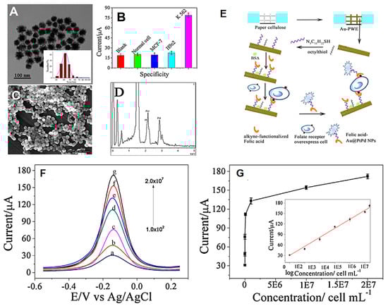 Figure 15. TEM image of dendritic Au@PtPd NPs (A), peak current response of the electrochemical sensor from the solution with various cell lines (B), SEM image of dendritic Au@PtPd NPs (C) and Energy-dispersive X-ray spectroscopy (EDS) image of dendritic Au@PtPd NPs (D). Schematic illustration of electrochemical sensor of cancer cells by deploying folic acid modified Au@PtPd NPs on paper device (E). The differential pulse voltammetry (DPV) curves of the electrochemical sensors toward various concentration of K-562 cell (F), calibration curve (inset, logarithm calibration curve) (Notes: pH 7.0PBS, 2 mM thionine and 10 mM H2O2 incubation for 20 min at room temperature) (G). Reproduced form [125], with permission from Elsevier, 2015.