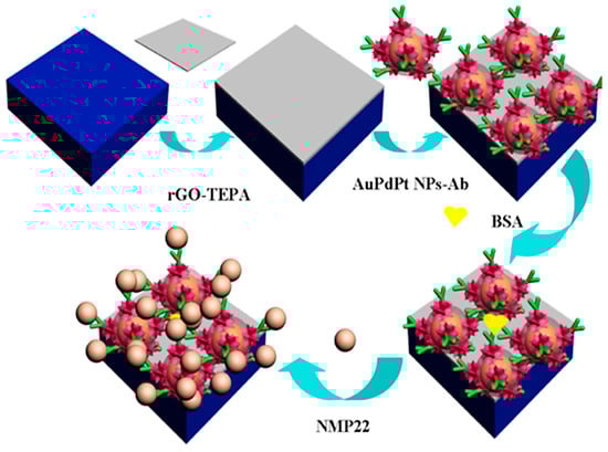 Figure 16. Schematic illustration of immunosensor for monitoring cancer biomarkers based on rGO-TEPA and trimetallic Au-Pd-Pt NPs. BSA: bovine serum albumin. Reproduced from [123], with permission from Elsevier, 2015.