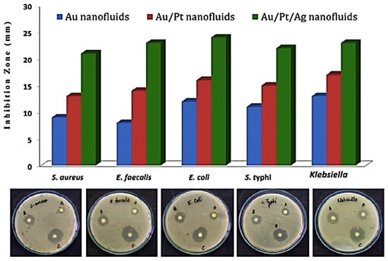Figure 17. Antibacterial activities of the produced nanomaterials in terms of inhibition zone; Histograms provided comparative zone inhibition of the nanofluids against various bacteria; ‘A’, ‘B’ and ‘C’ in the agar plates correspond to Au, Au/Pt, and Au/Pt/Ag nano-fluid, respectively. Reproduced from [40], with permission from Elsevier, 2018.