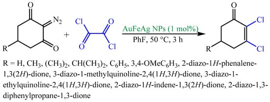Stable trimetallic Au-Fe-Ag NPs were produced in aqueous root extract of Astragalus membranaceus, which served as bioreducing and capping/stabilizing agents [108]. The hydroxyl and/or carbonyl groups of bioactive molecules from A. membranaceus plant, such as flavonoids, isoflavonoids, saponins, polysaccharides, and sterols, may be responsible for the reduction of Ag+, Au3+, and Fe3+ to Ag0, Au0, and Fe2+/Fe3+ NPs (Figure 8). The ensuing trimetallic hybrid NPs were applied as a magnetically retrievable green catalyst for the preparation of α,β- or β,β-dichloroenones from oxalyl chloride and diazodicarbonyl compounds (Scheme 1) [108].