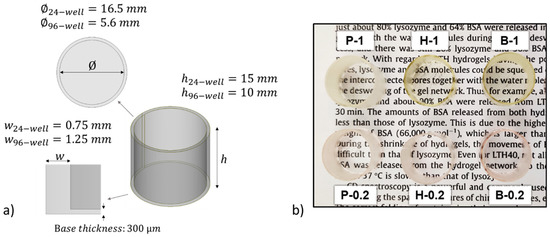 (a) Isometric view of the CAD designs showing the dimensions for 24- and 96-like-well fabrication. (b) Photograph of 3D printed 24-well-like objects from each prepared home-made resin.