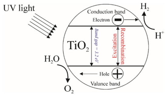 TiO2 is a wide-bandgap semiconductor. In nature, TiO2 is usually found in three different crystalline structures: rutile, anatase, and brookite. TiO2 in anatase form is the most widespread photocatalyst for hydrogen evolution [1]. However, it cannot be used in the spectrum of visible light, since its bandgap (Eg) for different crystalline phases (anatase—3.2 eV, rutile—3.0 eV, and brookite—3.3 eV) is in the UV region. Also, the efficiency of photocatalysis in addition to the bandgap depends on many other factors [2]. In the 1970s, Fujishima and Honda studied the photoelectrochemical splitting of water, where a TiO2-based electrode demonstrated the ability to split water under the influence of ultraviolet radiation [3]. Photocatalysis is a complex reaction consisting of the processes starting from light absorption to generate charge carriers up to surface catalytic reactions due to which gas is formed (Figure 1). This process only requires a photocatalyst (TiO2), which is not consumed during the entire process, water, sunlight or ultraviolet radiation. During the absorption of light (≥) by the photocatalyst, an excited electron () transfers from the valence band into the conduction band. This transition of the electron leads to the generation of a positively charged carrier-hole () in the valence band (Equation (1)). Also, these charge carriers can recombine among themselves (Equation (2)) [4,5].