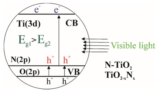 Doping with nitrogen atoms is the most popular way to improve the photocatalytic performance of TiO2. Introduction of nitrogen into the TiO2 structure contributes to a significant shift of the absorption spectrum into the visible region of the solar spectrum, a change in the refractive index, an increase in hardness, electrical conductivity, elastic modulus, and photocatalytic activity in regard to visible light [28,29]. Upon substitution of anions, a new level is formed above the valence band of TiO2 [30]. As shown in Figure 3, the presence of nitrogen leads to a change of the bandgap Eg1 (TiO2) > Eg2 (N-doped TiO2), thus contributing to the absorption of photons of light with lower energy.