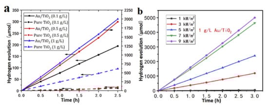 (a) Hydrogen evolution of pure TiO2 nanoparticles and Au/TiO2 nanoparticles at the same light intensity of 5 kW/m2; (b) Hydrogen evolution in 1–9 kW/m2 light intensities of 1 g/L Au/TiO2 solutions. Both figures are reprinted from [63], with permission from Elsevier, 2020.