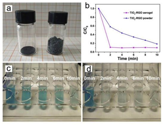 (a) Photograph of 80 mg TiO2-reduced graphene oxide (rGO) powder (left) and aerogel (right); (b) methylene blue (MB) dark adsorption results of the TiO2-rGO aerogel/powder; color changing of MB solution during dark adsorption with TiO2-rGO powder (c), and aerogel (d). All figures are reprinted from [77], with permission from Elsevier, 2020.