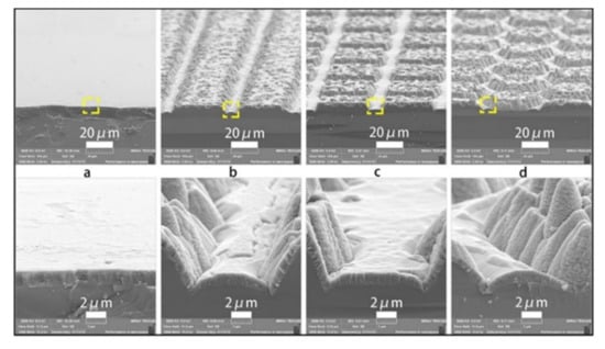 SEM images of (a) planar TiO2 film; (b) grating-structured TiO2 film; (c) square-structured TiO2 film; (d) hexagon-structured TiO2 film. All figures are reprinted from [89], with permission from Elsevier, 2019.