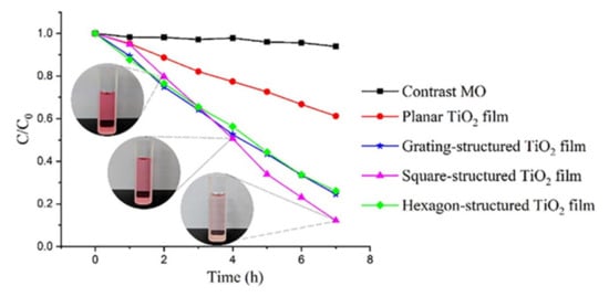 To evaluate the activity of photocatalysts, scientists conducted an experiment, in which the dye degradation occurred in water as a result of its exposure with UV (254 nm) on methyl orange. As shown in Figure 9, the microstructured TiO2 films exhibit a more active photocatalytic activity than TiO2 films with a flat surface. According to scientists, this is due to the presence of reaction centers on the surface of microstructured films. The highest photocatalytic activity was observed for TiO2 films with a square microstructure. The experimental results showed that the efficiency of photocatalysts is influenced not only by the surface area, but also by the type of their microstructure. It was revealed, that the TiO2 film with a grating structure, despite its low specific surface area, possessed photoactive properties similar to the TiO2 film with a hexagonal structure [89].