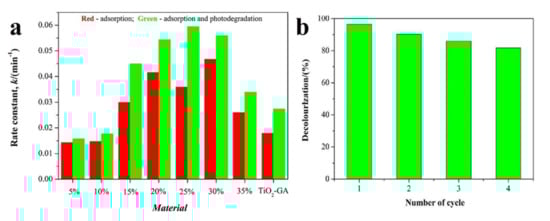 (a) The rate constants for the adsorption and the collective removal of rhodamine B (RhB) over TiO2-GA and the Fe2O3-TiO2-GA composites; (b) stability of the Fe2O3-TiO2-GA (25%) composites in the removal of RhB dye. Both figures are reprinted from [91], with permission from Elsevier, 2018.