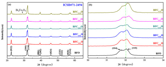 Figure 3a,b shows the X-ray diffraction (XRD) patterns of the BiFe1-xCoxO3 (BFCxO, x = 0.00, 0.01, 0.03, 0.05, 0.07 and 0.10) thin films. The diffraction peaks of all the samples are completely consistent with the standard XRD pattern of the rhombohedral phase (space group R3c) (JCPDS # 71-2494). Meanwhile, a weak XRD peak of impurity is found at 28.8° corresponding to Bi2Fe4O9 [17,21]. Bi2Fe4O9 will have no significant impact on the intrinsic structures and properties of BFCxO because it is paramagnetic and its content is relatively small in the samples [17,21]. Figure 3b shows magnified XRD patterns of Co substituted thin films at different concentrations in the vicinity of 2θ = 32°. Obviously, the diffraction peaks of (104) and (110) move at higher angles with the increase of Co3+ concentration, indicating that the Co ions have been successfully positioned in the host lattice of BFO. The radius of Co3+ ions is smaller than that of Fe3+ ions, which will lead to lattice contraction and structural distortion.