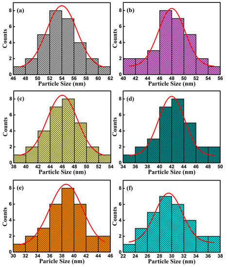The SEM images of surface and cross-section of BFCxO thin films are shown in Figure 5a–f. It can be seen that the Co-substituted thin films not only show a homogeneous surface morphology and conspicuous agglomeration, but also attach well to the silicon substrates without obvious separation. Additionally, the cross-sectional thickness of BFCxO thin films is 308, 293, 288, 261, 223 and 221 nm, respectively. With the increase of Co doping concentration, the thickness obviously decreases, indicating that Co doping makes the surface uniformly dense and grain size decreases [26,27]. The grain size histogram and Gaussian fitting also prove that the grain size decreases with the increase of the Co concentration, as shown in Figure 6. It is also caused by the smaller radius of the Co ions, and correspondingly, the lattice collapses and oxygen vacancies are formed [26,27,28,29]. The suppression of oxygen vacancy concentration will slow down the movement of oxygen ions and the growth rate of crystal grains, thus reducing the size of crystal grains [26].