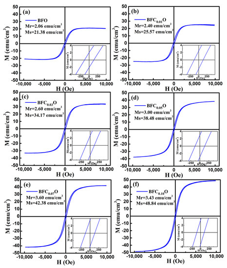 In order to explore the impact of Co doping on the magnetic properties at room temperature, we carried out the VSM measurements on BFO and BFCxO thin films in the magnetic field from 0 to 10 k Oe. The saturated magnetic hysteresis (M–H) loops of BFO and Co-doped thin films are shown in Figure 9a–f. With the increase of the Co doping concentration, the values of both saturation magnetization (Ms) and remanent magnetization (Mr) significantly increased. The values of Ms and Mr for BFO, BFC0.01O, BFC0.03O, BFC0.05O, BFC0.07O and BFC0.10O are 21.38 and 2.06, 25.57 and 2.40, 34.17 and 2.60, 34.48 and 3.00, 42.38 and 3.60, and 48.84 and 3.43 emu/cm3, respectively. The changes of Ms and Mr with the Co doping concentration are shown in Figure 10. Ms always increases linearly but Mr increases first and then decreases with the increase of Co3+ concentration over x = 0.10. The maximum value of Mr is 3.60 emu/cm3 when the concentration of doped Co is 0.07. Additionally, the maximum value of Ms is 48.84 emu/cm3 as the doping concentration is up to 0.10. According to the Goldschmidt tolerance factor t [26,27,28,29],