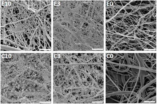 Furthermore, the fibrous scaffolds were functionalized with platelets and their morphology was examined using SEM (Figure 2). The acquired images showed a fine fibrin network formed on the electrospun and centrifugally spun scaffolds, with the two highest platelet concentrations (samples E10, C10, E3 and C3). On the samples with the lower platelet concentrations, the fibrin network was very scarce. The presence of the fibrin network was decreasing with the decreasing platelet concentration, and on the samples E0.1 and C0.1, no fibrin network was detected.