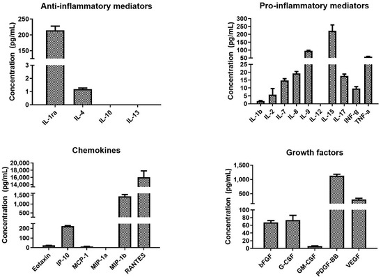 The concentrations of bioactive molecules contained in the platelets were determined using X-MAP (Multi-Analyte Profiling) technology. The obtained results are shown in Figure 3 and the obtained values are summarized in Supplementary Table S1. The acquired data confirmed that platelets contained various pro- and anti-inflammatory cytokines, chemokines, and growth factors. The most abundantly present bioactive molecules were chemokine RANTES and PDGF-BB. Furthermore, the platelet lysate contained a high level of TSP-1 (1.9 ± 0.7 µg/mL) and TGF-β1 (59.3 ± 2.6 ng/mL). The data are included in Supplementary Table S1.