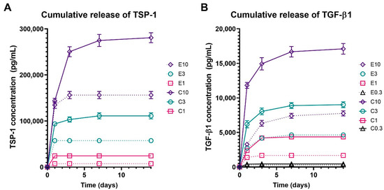 Cumulative release of thrombospondin-1 (TSP-1) and transforming growth factor beta (TGF-β1) from the platelet functionalized electrospun and centrifugally spun samples. In the scaffold abbreviations, E stands for electrospun samples, C for centrifugally spun samples and the number indicates the fold change of the physiological concentration of platelets (300 × 109 platelets/L). Only data for the samples with analyte concentration above the detection limit of the assay are shown. (A)—Cumulative release of TSP-1 from the electrospun (E10, E3, E1) and centrifugally spun (C10, C3, C1) samples. (B)—Cumulative release of TGF-β1 from the electrospun (E10, E3, E1, and E0.3) and centrifugally spun (C10, C3, C1, and C0.3) samples.