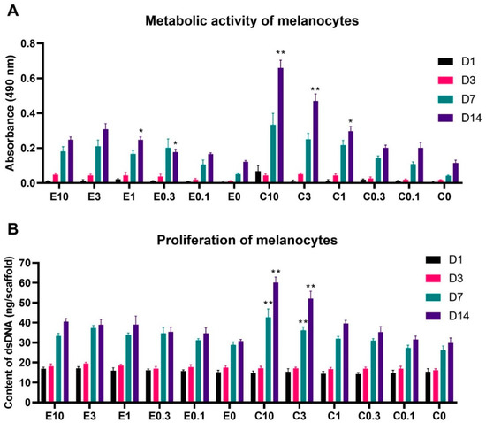 A similar trend was observed in the melanocyte proliferation data shown in Figure 5B (full statistical analysis shown in Supplementary Figure S3). There were only moderate statistically significant differences in the proliferation of melanocytes seeded on the electrospun scaffolds, with the E3 scaffold achieving the highest proliferation on day 7 of the experiment. Furthermore, the scaffolds with the three highest platelet concentrations (E10, E3, and E1) reached a significantly improved proliferation, in comparison to the E0 sample on day 14. The differences in melanocyte proliferation were more pronounced on the centrifugally spun samples. Until day 3, there were no statistically significant differences in melanocyte proliferation. However, on day 7, the proliferation of melanocytes seeded on the centrifugally spun scaffolds with the highest platelet concentration (C10), was significantly higher when compared to all the other centrifugally spun scaffolds, followed in the trend by the second highest platelet concentration (C3). The same trend was observed on day 14 of the experiment. The melanocyte proliferation on samples C1 and C0.3 was improved, compared to the plain PCL control C0. However, on the sample functionalized with the lowest platelet concentration (C0.1), no improvement in melanocyte proliferation was achieved. The overall statistical analysis (data not shown in the graph) confirmed the trend observed in the metabolic activity data. On day 7, the metabolic activity of melanocytes seeded on the centrifugally spun C10 scaffold showed the highest proliferation, when also compared to all the centrifugally spun and electrospun scaffolds. Furthermore, the response was further observed on day 14, when the C10 and the C3 samples showed a superior proliferation when compared to all the electrospun samples (in addition to the centrifugally spun samples). Similarly, there was no difference in the proliferation of melanocytes seeded on the E0 or C0 control samples, suggesting the sole effect of the platelet-derived molecules on the behavior of melanocytes, regardless of the scaffold morphology.