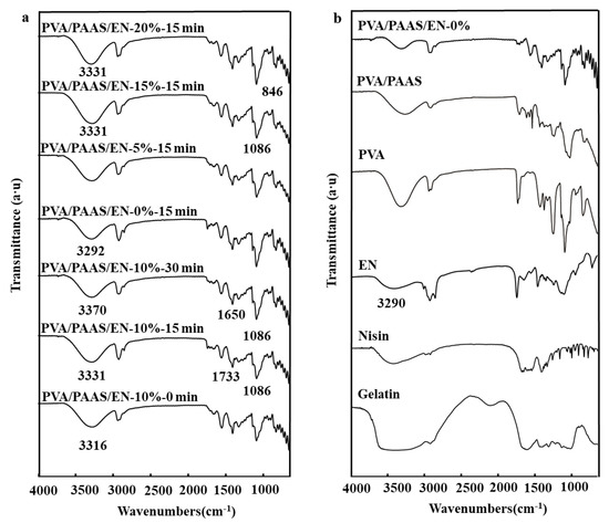 Figure 3 shows characteristic ATR-FTIR spectra corresponding to nanofibers subjected to different ultrasonication times and EN concentrations. The first peak of nisin was attributed to O-H and N-H axial stretching at 3401 cm−1 and the stretching vibration of C-H bond appeared at 2964 cm−1. In addition, the weakening of the peak at 1738 cm−1 of EN indicated that the combination of soy oil and nisin resulted in the weakening of the characteristic absorption of the C=O group and the NH3+ band disappears completely [40]. Figure 3 shows that nisin was embedded in the W/O/W emulsions and was bonded by hydrogen bonding to maintain certain structural characteristics of EN. For the PVA/PAAS/EN nanofibers, the bands at 3370 cm−1 and 1650 cm−1 were caused by stretching the hydroxyl group and C=C bonds, respectively [41]. The characteristic PVA peaks were at 3292 cm−1, 1086 cm−1, and 846 cm−1. The first peak was attributed to the stretching of the O-H bonds and the last two were the result of a CH2 stretching vibration and a peak caused by C-O stretching at 1733 cm−1 [42]. Figure 3 shows that the intensities of all absorption peaks increased after ultrasonication because the treatment increased the vibrational dipole moment and the exposed group [43]. The characteristic peaks of the nanofibers after ultrasonication were 3316 cm−1 and 3331 cm−1. The hydrogen interactions were stronger than those for nanofibers subjected to short-duration- or no ultrasonication. A comparison of the infrared spectra for ultrasonicated and untreated nanofibers indicated that an optimal ultrasonication time strengthened the intensities of the O-H absorption peaks and increased the numbers of hydrogen bonds. This finding was consistent with the observed morphology. As shown in Figure 3, the O-H absorption peaks shifted from 3292 cm−1 in the PVA/PAAS/EN-0% nanofibers to 3331 cm−1 in the PVA/PAAS/EN-15% nanofibers [44]. Hence, new hydrogen bonds formed and the addition of EN strengthened the intensities of the O-H absorption peaks. This observation corroborates that which was reported by Yuan et al. [45]. However, no significant changes were observed in any other characteristic nanofiber peaks. For this reason, the physical mixing of EN and PVA/PAAS resulted in a complex formation.