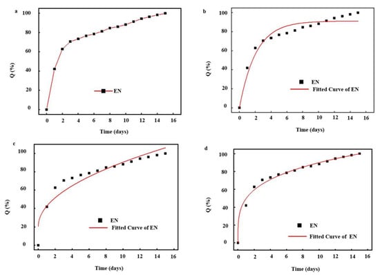 (a) Actual kinetic release profiles of nisin from nanofibers; the corresponding fitted curves following first order (b), Higuchi (c), and Korsemeyer–Peppas (d) models.