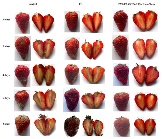 To investigate the application potential of PVA/PAAS/EN nanofibers in food preservation, the prepared nanofibers were utilized to pack strawberries. Figure 8 presents the appearance of the strawberries during the 8 days of storage. Strawberry quality decreased with time increasing in all groups. According to the results, strawberry quality decreased as the time increased in all groups; the control and PE-packaged strawberries both had an unacceptable appearance after two days and four days of storage respectively, while the PVA/PAAS/EN nanofibers maintained excellent surface. This means that the nanofibers can effectively extend the shelf life of strawberries for 6 days, which is significant for strawberry deterioration. It is interesting that the PE-packed strawberries began to decay after 4 days, and the decay rate was faster than that of the control. As shown in Figure 8, the surface of the PE-packed strawberry was completely rotten and covered with mold, which is because PE acted as a semipermeable barrier against gas and water and accelerated microbial growth. This effect is consistent with the study by Jiang et al. [78]. However, PVA/PAAS/EN nanofibers are so soft and absorbent that they not only absorb the water from the surface of strawberries effectively but also inhibit microbial growth due to the nisin release.