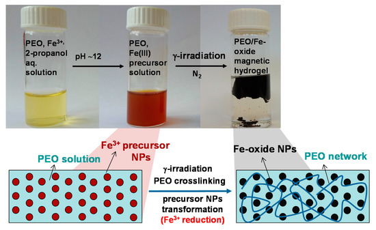 Iron(III) chloride salt was used for the synthesis of iron oxide nanoparticles. PEO/iron(III) precursor suspensions were prepared by firstly dissolving PEO powder to prepare 1.85 wt% aqueous solutions, followed by the addition of 2 M FeCl3 aqueous solution to the final concentrations of initial Fe3+ ions in solutions being 0.35 × 10−2 M, 1.75 × 10−2 M, and 7 × 10−2 M. These Fe3+ concentrations in solutions correspond to mass percentages of Fe3+ of 1, 5, 20 wt% relative to total PEO and Fe3+ mass, respectively. In addition, one batch of precursor solutions wasprepared from 4 wt% PEO aqueous solutions with the same concentrations of Fe3+ salt. The solutions were irradiated with or without 2-propanol. The final concentration of 2-propanol in solutions was 0.2 M. In addition, few solutions were prepared containing four times more 2-propanol (0.8 M). The pH of suspensions was adjusted to pH = 11.5–12 with 2 M NaOH aqueous solution. The prepared precursor suspensions were bubbled with nitrogen through rubber septa for 30 min in order to remove dissolved oxygen before γ-irradiation. γ-irradiation of deoxygenated suspensions in septum-closed glass vials was performed at room temperature in a 60Co γ-irradiation facility located in the Radiation Chemistry and Dosimetry Laboratory at the Ruđer Bošković Institute. The suspensions were irradiated to doses of 50, 130 and 300 kGy and at a dose rate of ~27 kGy h−1. Irradiation of PEO/Fe(III) precursor suspensions resulted in the formation of gels or suspensions. The schematic presentation of the synthesis procedure of magnetic PEO/iron oxide nanocomposite hydrogels is given in Figure 1.