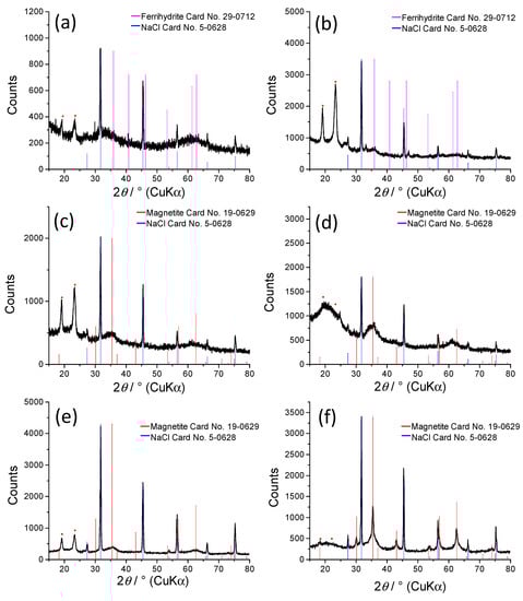 Figure 6 presents the XRD patterns of unirradiated precursor (Figure 6a) and PEO/Fe-oxide gels obtained upon irradiation of suspensions with 2-propanol (0.2 M) and 5 wt% Fe3+ at 50 kGy (Figure 6b), 130 kGy (Figure 6c) and 300 kGy (Figure 6d), as well as 20 wt% Fe3+ at 130 kGy (Figure 6e) and 300 kGy (Figure 6f). The XRD patterns (Figure 6a–e) show two maxima which can be attributed to iron oxide phases. The XRD patterns of the precursor and the gel obtained at 50 kGy (Figure 6a,b) were ascribed to ferrihydrite and NaCl as an impurity. The XRD patterns of gels obtained at 130 and 300 kGy (Figure 6a–e) were attributed to magnetite NPs. On the other hand, the gel obtained from 20 wt% Fe3+ suspension at 300 kGy (Figure 6f) had sharper and more distinct maxima, indicating improved crystallinity of the formed magnetite NPs, which is in line with the results of Mössbauer spectrometry. The distinct maxima at ~19 and ~23° on the XRD patterns of composite gels obtained at 50 and 130 kGy are the result of partial crystallization of PEO gels upon drying. These maxima completely disappeared on the XRD pattern of nanocomposite gel obtained at 300 kGy and only wide amorphous halo is visible, due to the very dense crosslinking density of gel obtained at 300 kGy. The results of line broadening analyses are given in Table 1. The volume-averaged domain sizes (Dv) of the dominant crystalline phase in the synthesized samples were estimated using the Scherrer equation: