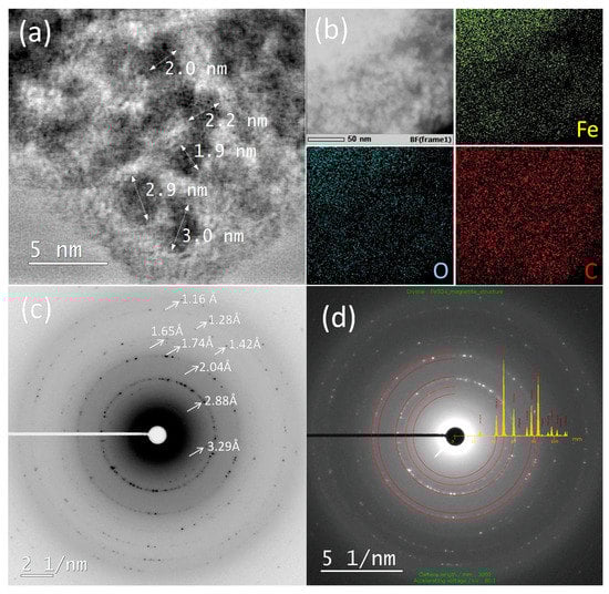 STEM bright-field image of the gel obtained at 130 kGy from 20 wt% Fe3+ suspension (a); EDXS elemental mapping of the gel where yellow, blue, and red colors represent iron (Fe), oxygen (O), and carbon (C), respectively (b); SAED (selected area electron diffraction) of spherical nanoparticles (NPs) with marked interplanar distances (c); SAED of spherical NPs indexed as magnetite (Fe3O4) (d).