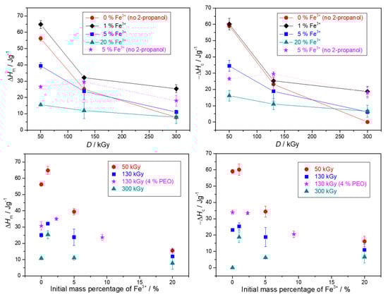 The thermal properties of obtained nanocomposite gels in dependence on the γ-irradiation dose and the initial Fe3+ concentration were studied by differential scanning calorimetry. The DSC thermograms are given in Figure S2 in Supplementary Materials, while the phase transformation enthalpies and temperatures of the second heating and first cooling cycles are given in Figure 10, Figure 11, Figures S3 and S4. The results are presented in dependence on both the irradiation dose and the mass percentage of Fe3+ in precursor suspensions, as some effects are easier to observe. It must be emphasized again that when comparing the results of pure PEO gels with those of nanocomposites, one has to take into account that pure PEO gels were formed on irradiation without 2-propanol, because with 2-propanol in pure PEO solutions gels were not formed. Therefore, the difference between pure PEO gels and nanocomposite gels is not solely due to the amount of NPs within the gel, but also due to the influence of 2-propanol on network formation.