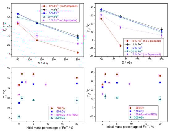 Melting (Tm) and crystallization (Tc) temperatures of the 2nd heating cycles and 1st cooling cycles, respectively, of the obtained gels in dependence on the irradiation dose and the mass percentage of Fe3+ in precursor suspensions. Unless otherwise indicated, the precursor suspensions were prepared from 1.85 wt% PEO solutions and with 0.2 M 2-propanol.