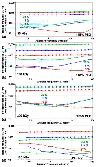 Figure 13 presents the frequency sweep measurements. Frequency sweeps describe the time-dependent behavior of a sample in the non-destructive deformation range. The investigated samples are true chemically crosslinked gels. The frequency sweep of pure PEO and magnetic nanocomposite gels showed constant storage modulus (G′) values within the entire frequency range (100 rad/s to 0.05 rad/s). Pure PEO and PEO/Fe-oxide gels showed similar behavior at lower frequencies, but at higher frequencies, pure PEO gel obtained more ordered structure, better homogeneity (lower loss factor) compared to nanocomposite gels with higher loss factor values (because of increase of loss modulus at higher frequences). The same remarks related to internal gel microstructure have been seen for pure PEO gels and nanocomposites at different doses except for gels from 4 wt% of PEO.