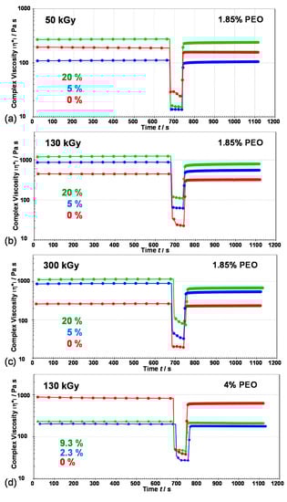 Results of 3ITT thixotropy test are given in Figure 14 and Figure S6. Thixotropy is a time-dependent phenomenon. It can be defined as the shear thinning behavior of a viscoelastic gel sample upon the application of a destructive strain and the subsequent recovery of the viscoelastic properties after cessation of the strain. Figure 14 shows the evaluation of complex viscosity and Figure S6 the evolution of G′ and G″ of gels after applying the destructive strain. The sample behavior switched from gel-like to sol-like, with G″ values higher than G′. After that, the original conditions reapplied and the recovery of viscoelastic properties of gels was observed. Recovery ratios of gels within 60 s are given in Table 3. The initial Fe3+ amount, that is the amount of NPs formed, and the density of the PEO network formed at a specific γ-irradiation dose influenced the self-recoverable properties of the new nanocomposite materials. The most prominent recovery of the viscoelastic properties was observed for gels from 1.85 wt% PEO suspensions at 50 kGy and gels from 4 wt% PEO suspensions at 130 kGy (Table 3). The recovery of pure PEO gel at the specific irradiation dose was always better compared to the nanocomposite gels (indicating very good microstructure integrity of pure PEO gel), except for gels obtained from 4 wt% PEO suspensions. The lowest recovery was observed for gel obtained at 300 kGy from 20% Fe3+ suspension (57.1% recovery in 60 s). Better recovery was observed for all gel samples with lower G′ values compared to the recoverable properties of the most potent gels.