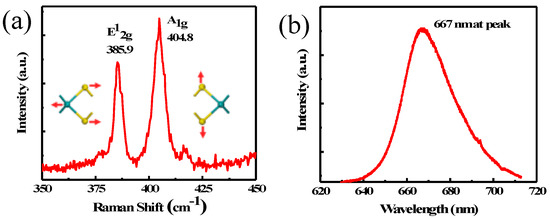 Raman spectrum measurement provides a convenient and nondestructive method to measure the layer number of 2D materials [32,33]. There are two Raman peaks corresponding to in-plane vibration mode E12g and out-of-plane vibration mode A1g of MoS2, respectively. The separation between these two peaks depends on layer number. The measured Raman spectrum shows characteristic peaks of MoS2 with in-plane mode E12g at 385.9 cm−1 and out-of-plane mode A1g at 404.8 cm−1, as shown in Figure 2a. The difference between these two modes is 18.9 cm−1, which indicates a monolayer MoS2 [33]. Photoluminescence (PL) is another useful non-destructive method to evaluate the crystal quality of MoS2 film. The principle of PL measurement involves using a laser with photon energy greater than the semiconductor energy bandgap to excite electron–hole pairs in the sample. The excited electron–hole pairs relax to band edge and recombine to emit photons when the material is in good quality. If there are many defects in the material, the emission will be broad and weak due to loss to non-radiative recombination at defects. Figure 2b shows the measured PL spectrum with a distinct emission peak at 667.5 nm, corresponding to a bandgap of ~1.86 eV. The PL spectral linewidth is ~28 nm, which indicates a reasonably good material quality [25].