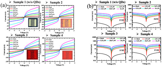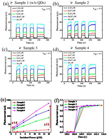 From the measured photocurrent response, we obtain the photoresponsivity as a function of illumination power for all samples at Vds = 3 V, as shown in Figure 6. The photoresponsivities of Sample 1 to 4 at 16 μW illumination power are 1.0, 5.7, 8.6, and 11 mA/W, respectively. The photoresponsivity increases as QD density increases. This is expected because there are more QDs to absorb incident photons. The increasing rate, however, is slightly reduced as QD density increases. At 1.3 μW illumination power, the photoresponsivities of Sample 1 to 4 become 1.7, 12, 19, and 26 mA/W, respectively. For all samples, we see the photoresponsivity decreases as illumination power increases. This dependence could be attributed to several factors [25,39,40]. It could be due to the decrease of space charge region when illumination intensity increases. The decrease of space charge region is accompanied by a reduced internal field. This internal field is important for preventing the recombination of the photoexcited excitons. The generation rate of free charge carriers thus decreases. Heating effect and the saturation of sensitizing traps in QDs and at high illumination intensity may also result in a decrease in photoresponsivity [41,42,43]. The higher photoresponsivity at lower illumination power leads to a higher photoresponsivity enhancement. Comparing Sample 1 and 4, the photoresponsivity is enhanced by 14 times at 1.3 μW, as compared with 11 times at 16 μW illumination power.