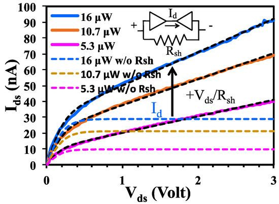 We now study the nonlinear dependence of Ids on Vds using a Schottky junction model. The change from initial fast increase to a slow increase in Ids–Vds curve resembles the I–V characteristic of two back-to-back Schottky junctions [34,35,36]. Theoretically, Ids is limited by the reverse saturation current of Schottky junction when Vds is large. In a more advanced theory, the saturation current depends on the exponential of the fourth root of Vds by image force Schottky barrier lowering or square root of Vds by electrostatic doping [37,38]. Interestingly, we observe a linear increase of Ids in the Vds > 0.5-volt range. This does not fit to the exponential dependence on the fourth or square root of Vds. To describe this linear dependence on Vds, we introduce a shunt resistance Rsh in parallel to a balk-to-back Schottky junction circuit model, as shown in the inset of Figure 4. This resistance decreases as illumination intensity increases, as indicated by the increasing Ids/Vds slope in Figure 3a when illumination intensity increases. Using standard Schottky diode equation, the voltage drop across the back-to-back Schottky junctions, one under forward VF and the other reverse VR bias, are