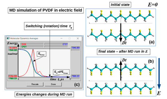 Scheme of the MD run process for a 2 PVDF-6 chains model with PM3 (in restricted Hartree-Fock approximation–RHF) calculations at each MD run step: (a) initial state; (b) final state after the MD run with dipole moment D orientation turned (switched) in the opposite direction in the electric field E; (c) changes of the MD average energies trajectory over time during the MD run (in ps) and the time of the switching τs for this PVDF system (red–kinetic energy, blue–total energy, green–potential energy). Reproduced with permission from [18]; Elsevier, 2014.