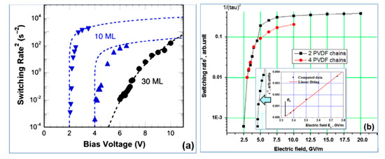 Switching time τs for polymer ferroelectrics presented as τ−2 along E in a logarithmic scale: (a) experimental data [14,15] for thin LB of P(VDF-TrFE) film of 10 ML (5 nm) with critical behavior of τ−2 for E → EC in comparison with thick 30 ML (15 nm) films with exponential low (Reproduced with permission from [14]; AIP Publishing, 2011); (b) MD simulation run data [18,19] for PVDF models showing the critical behavior of τ−2 with a change in E, which qualitatively coincides with the experimentally observed behavior; the inset shows the linear behavior of τ−2 as E → EC and determines the critical value of EC ~ 2.3 GV/m (Reproduced with permission from [18]; Elsevier, 2014).