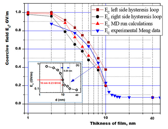 The dependence of the coercive field of the ferroelectric polymer PVDF on the film thickness, according to the results of calculations by different methods (from hysteresis loops and MD runs) in comparison with experimental data [16] (inset (b) is from Figure 4), taking into account the dielectric constant of an ultrathin molecular film ε ≈ 2.4. (It is our new original recalculated data, which continues from our preliminary calculations and estimations [18,19,27,28]).