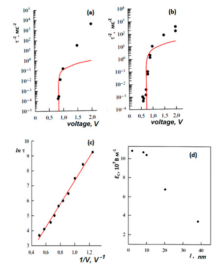 The dependence of the switching time τ on the applied voltage for 8-nm-thick BaTiO3 film [1,3,22]: (a) in the capacitor and (b) in the probe mode in an atomic force microscope (lines τ−2 (V) on (a) and (b) correspond to the calculations according to formula (7)); (c) for a BaTiO3 crystal, the line corresponds to ln[τ(V−1)] and is obtained relying on the piezo-response mode in an atomic force microscope; (d) the dependence of the coercive field on the thickness of the BaTiO3 film. Reproduced with permission from [22]; Elsevier, 2013.