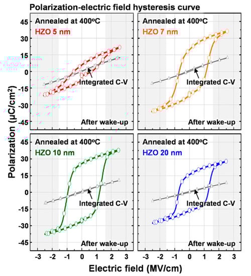Polarization-electric field hysteresis and integrated capacitance voltage hysteresis curves of 5-, 7-, 10-, and 20-nm-thick HZO-based metal–insulator–metal (MIM) capacitors after wake-up field cycling (Reproduced with permission from [35]; AIP Publishing, 2018).