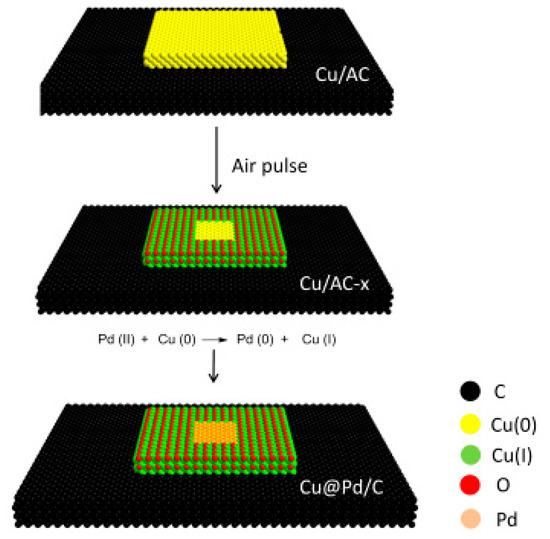The preparation of Cu@Pd/C catalysts is illustrated in Figure 1. Firstly, Cu/C was synthesized by carbothermal reduction in N2. Then, the surface of the Cu was partially oxidized to Cu(I) by the pulse injection of a limited amount of air at 473 K. The Pd was introduced to the surface of Cu particles by the displacement reaction of Cu(0) by Pd(II). As the displacement reaction was only conducted on Cu(0), the Pd(0) was confined to a limited area surrounded by Cu(I). As a result, the aggregation of Pd atoms to form larger particles was prevented by the surrounding Cu(I) species.