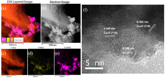 Energy-dispersive spectroscopy (EDS) mapping images (a–e) of Cu/C-320 and HRTEM (f) image of Cu/C-320.