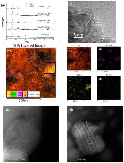 XRD patterns (a) of Cu@Pd/C-320, HRTEM (b), EDS mapping images (c–g), and high angular annular dark field scanning TEM (HAADF-STEM) images (h,i) of Cu@Pd0.5/C-320. The single Pd atoms (indicated by red circles) and Pd clusters (indicated by green arrows) could be seen in the HAADF-STEM images.