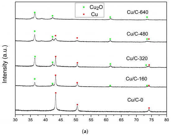 The EDS mapping of Cu/C-320 is shown in Figure 2a–e. The Cu, C, and O were detected in the sample. The distribution of O did not always follow the distribution of Cu. In other words, the signal of O and Cu did not always appear in the same areas. This phenomenon can be explained in this way. When an area had the signal of Cu without O, it should be the signal for Cu(0). The simultaneous appearance of Cu and O was mostly as the oxidized Cu. So, both Cu(0) and oxidized Cu were contained in Cu/C-320 revealed by the EDS mapping. This result was confirmed by the XRD and HRTEM characterization. The diffraction peaks corresponding to both Cu and Cu2O appeared in the XRD pattern of Cu/C-320 (Figure 3a). The HRTEM image of Cu/C-320 was exhibited in Figure 2f. The crystalline domains corresponding to both Cu (d111 = 0.210 nm) and Cu2O (d110 = 0.305 nm) could be observed in the image. Based on the above characterization, the Cu/C-320 should possess a surface composed of Cu and Cu2O after the pulse injection of air.