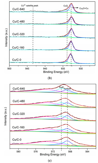 To illustrate the role of Cu(I) during the preparation of catalysts, Cu/C with different Cu2O content were prepared and used for the synthesis of Cu@Pd/C. The oxidization degree of Cu on Cu/C was controlled by changing the amount of air injected. The XRD patterns of Cu/C are shown in Figure 6a. After the carbothermal reduction in N2, diffraction peaks corresponding to metallic Cu were observed in Cu/C, and no diffraction peaks of Cu2O were found in the XRD pattern. Then, the air was injected under N2 atmosphere at 498 K to partially oxidize the Cu nanoparticles on Cu/C-0. After the injection of 160 mL of air, diffraction peaks ascribed to Cu2O emerged in the XRD pattern of Cu/C-160. As the amount of air injected increased, the diffraction peaks corresponding to Cu2O increased, while those corresponding to Cu decreased. Two tiny diffraction peaks (35.5° and 38.7°) ascribed to CuO could be observed on Cu/C-480. When 640 mL of air was injected, diffraction peaks of metallic Cu disappeared, and the peaks of CuO enlarged a little. It is obvious that the Cu was controllably oxidized to Cu2O by the injected air, and the large amount of air led to the presence of CuO. The oxidation states of the surface Cu were further characterized by XPS (Figure 6b) and AES (Figure 6c). The satellite peak of CuO at 943.4 eV in the XPS spectra was not obvious in all the Cu/C samples except for Cu/C-640. The Cu/C-640 sample showed a tiny but obvious CuO satellite peak in the XPS spectra [81]. This showed that the CuO was not the main species on the surface of Cu nanoparticles. However, the peak areas of CuO at 933.7 eV did increase as the amount of air increased. As the Cu2O and Cu had similar binding energy in the XPS spectra, the AES spectra was employed to distinguish the Cu2O and Cu. The binding energy at 568.5 eV was considered to be the signal of CuO and Cu [81,82]. The low content of CuO on the surface was revealed by the XPS results, which showed that this 568.5 eV peak was mostly caused by the metallic Cu. The peak centered at 570.0 eV was ascribed to the Cu2O [81,82]. It could be seen that there was a small portion of Cu2O in Cu/C-0 after the carbothermal reduction in N2. This could be caused by the short exposure to air during the preparation process. As the amount of air injected increased, the peak ascribed to Cu2O increased, while the peak ascribed to Cu decreased. The results indicated that more and more metallic Cu was oxidized on the surface as more air was introduced. The content of Cu species on the surface could be easily regulated by the control of air injected.