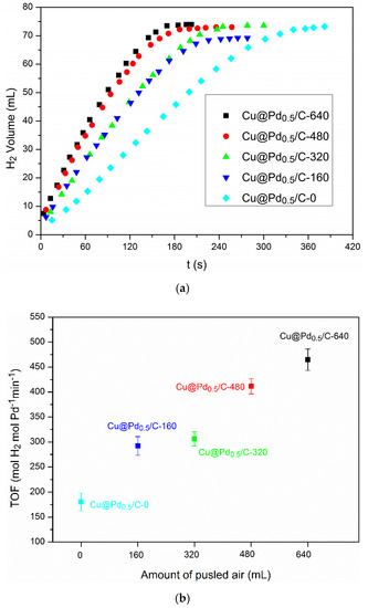 The Cu/C with different Cu2O content was used for the preparation of Cu@Pd/C by the galvanic reduction method. The hydrolysis of AB was conducted to evaluate the Cu@Pd/C prepared from Cu/C with different Cu2O content. The results are shown in Figure 7. The TOF on Cu@Pd/C-0 was 180 molH2 min−1 molPd−1, which was much higher than the TOF on commercial Pd/C and Pd0.5Cu/C prepared by the impregnation method, showing the superiority of the galvanic reduction method. The activity could be further improved by the partial oxidation of the surface of Cu nanoparticles on Cu/C before the galvanic reduction process. The TOF increased as the surface oxidation of Cu was enhanced. The reason for this increase could be explicated as follows. The surface of Cu nanoparticles was divided by Cu(I) into discrete pieces of metallic Cu, which acted as a reducing agent for Pd(II). The Cu(I) did not react with the Pd(II) during the galvanic reduction process. As a result, the reduced Pd(0) was confined to the original position of Cu(0), and the aggregation of Pd(0) was restricted by the Cu(I) during the preparation process. The best TOF value (465 molH2 min−1 molPd−1) was acquired on Cu@Pd/C-640 owing to its highest content of Cu2O. Table 1 summarizes the TOF values for the reported palladium catalysts in the hydrolysis of AB. It can be seen that the TOF values on Cu@Pd/C were among the highest TOF values reported in the literature.