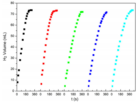 The stability of the catalysts was studied using Cu@Pd0.5/C-320 as catalysts at 298 K. After each reaction, another 1 mmol of AB was added into the reactor to record the hydrogen released from AB vs. time. The results are shown in Figure 8 and Figure S10. The catalytic performance was well maintained in five continuous processes. The used catalyst Cu@Pd0.5/C-320-R was characterized by EDS mapping (Figure S4), HRTEM (Figure S13), TEM (Figure S14), and ICP-OES (Table S1). The content of Pd was well kept after the five recycles indicated by the ICP-OES characterization (Table S1). No agglomerated palladium particles were observed, as there had been no crystalline domains corresponding to Pd in the HRTEM (Figure S13), and the TEM mappings exhibited a uniform distribution of Pd (Figure S4). These results showed very well the reusable performance of the Cu@Pd/C catalysts.