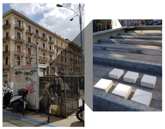In a subsequent investigation, the photocatalytic performances of limestone surfaces covered with a coating of water dispersed TiO2 NPs were evaluated in an urban environment (Bari, a port city in southeastern Italy from February 2016 to January 2017) (Figure 2) [108]. Data were collected by evaluating the concentrations of air pollutants (PM, NOx, CO, and benzene) in urban environmental conditions at the exposure site on a daily average basis for the varying climatic parameters (temperature, rain, wind, and light exposure). The daily mean values for NOx concentrations ranged from 50 to 110 μg/m3, with an average of 73 μg/m3. The other vital results on NOx removal were as follows: NO2 daily mean concentrations were between 30 and 60 μg/m3, with an annual average of 45 μg/m3. The results were assessed based on the European Union (EU) limit values for NO2 concentrations. As per the EU’s suggestion, NOx removal concentrations of annual mean and 18 h mean per year were considered as 40 μg/m3 and 200 μg/m3, respectively [109].
